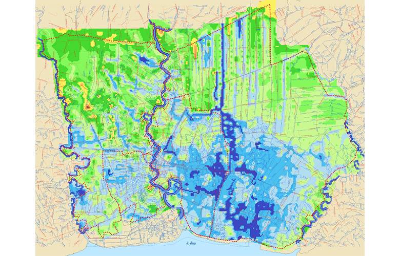 แผนที่นี้จะแสดงระดับความสูงต่ำของพื้นที่ โดยไล่เป็นระดับสีไป พื้นที่สีน้ำเงินเข้ม จะเป็นพื้นที่ที่มีระดับต่ำกว่า 0 เมตร จากระดับน้ำทะเลปานกลาง ไล่ไปจนถึงพื้นที่สีน้ำตาลที่มีความสูง 3.5 เมตรขึ้นไป จากระดับน้ำทะเลปานกลาง