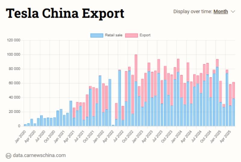 โรงงานประกอบในเซี่ยงไฮ้ ส่งออกรถยนต์ได้ 90,949 คัน ลดลง 33.4% จากช่วงเดียวกันของปีก่อน อย่างไรก็ตาม ในเดือนพฤษภาคม Tesla ส่งออกได้ 23,074 คัน เพิ่มขึ้น 33% จาก 17,358 คันของปีก่อน