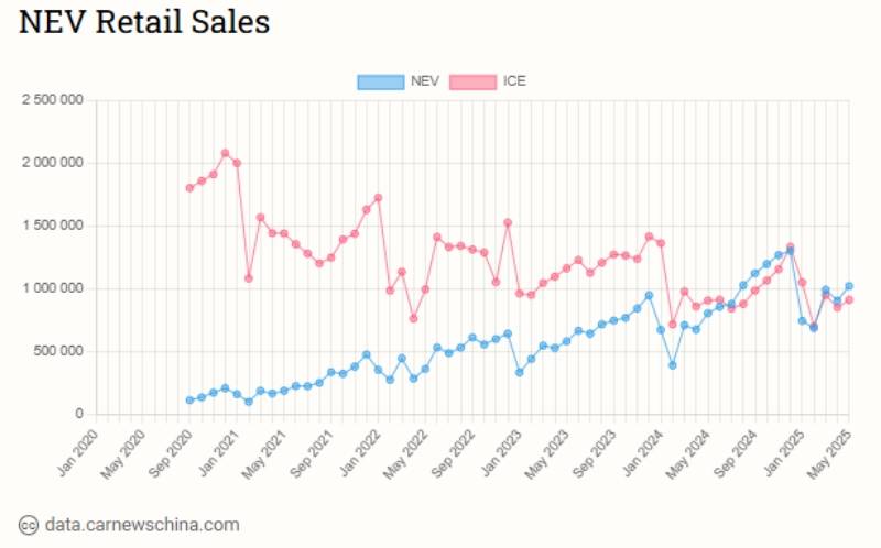 ขณะเดียวกัน ยอดขายรถยนต์ไฟฟ้าในจีนแตะระดับ 1,021,000 คันในเดือนพฤษภาคม เพิ่มขึ้น 28% จากปีก่อน แบ่งเป็นยอดขายรถยนต์ไฟฟ้าแบบ BEV อยู่ที่ 607,000 คัน เพิ่มขึ้น 22.4% จากปีก่อน