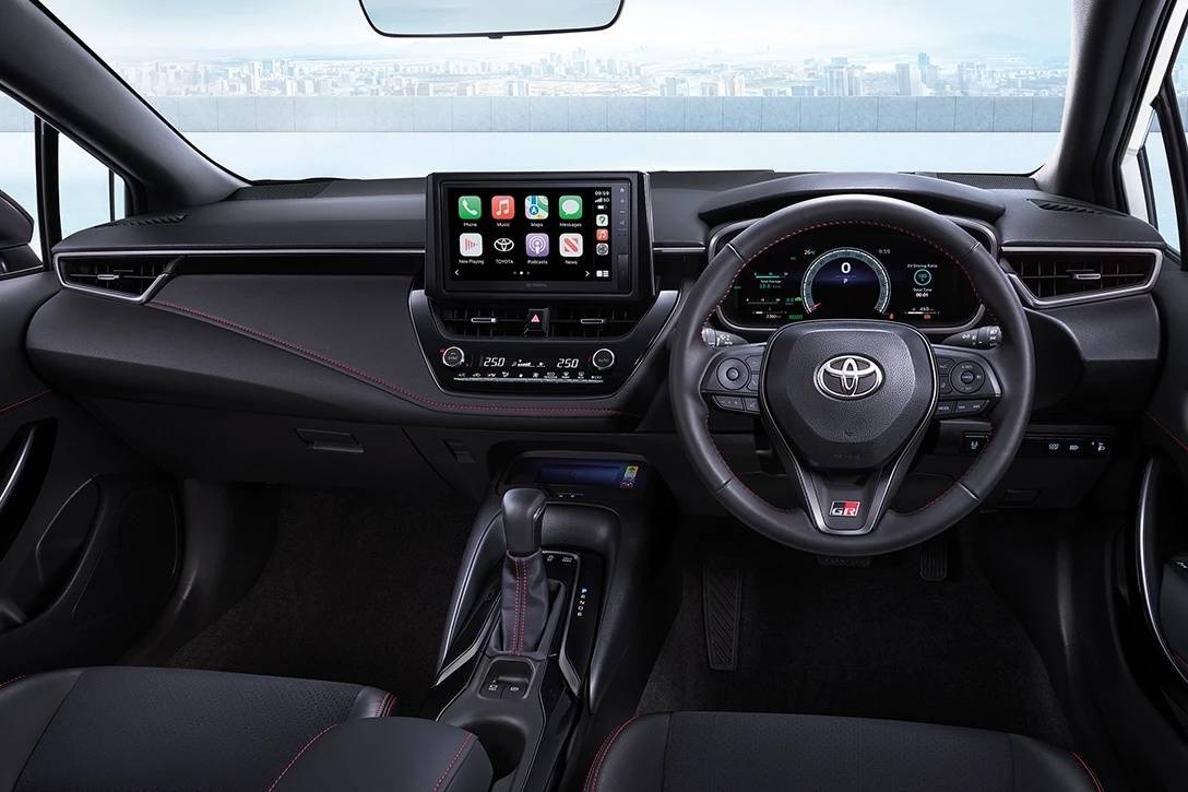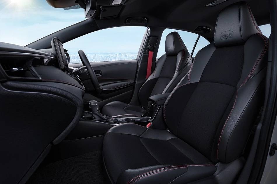 ภายในเพิ่มสีสันใหม่ด้วยใหม่ เบาะนั่งคู่หน้าทรงสปอร์ต หนัง Suede แบบเจาะรูและหนังสังเคราะห์เดินด้ายสีแดง พร้อมสัญลักษณ์ GR ปรับไฟฟ้า 8 ทิศทาง และ Lumbar Support แบบไฟฟ้า เข็มขัดนิรภัยสีแดงสไตล์ GR SPORT ภายในเดินด้ายสีแดง ตกแต่งสีแดงและสีเงิน Smoked Silver พวงมาลัยมัลติฟังก์ชัน 3 ก้าน ตกแต่งสัญลักษณ์ GR