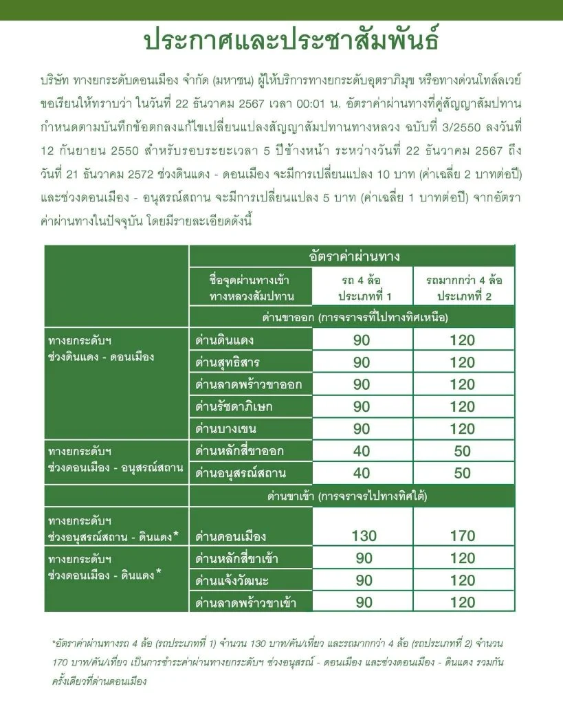 โทล์เวย์ดอนเมือง จะปรับขึ้นราคา เริ่มวันแรก 22 ธันวาคม 2567 ปลายปีนี้ ไปจนถึง วันที่ 21 ธันวาคม 2572